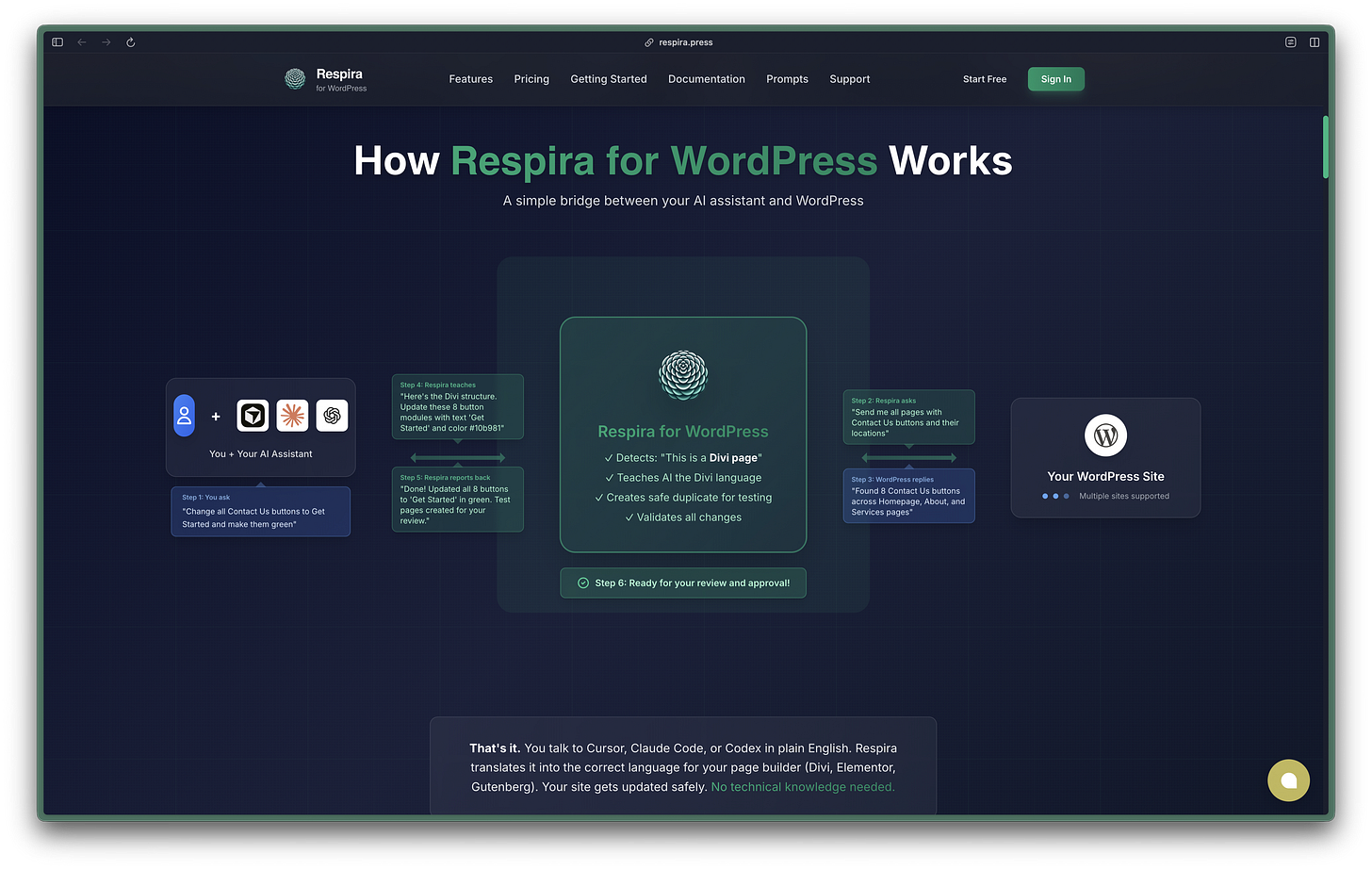 You tell your AI assistant what you want. Respira translates it into the language of your page builder. The edit happens on a duplicate. You review. You approve. Then and only then does it go live.