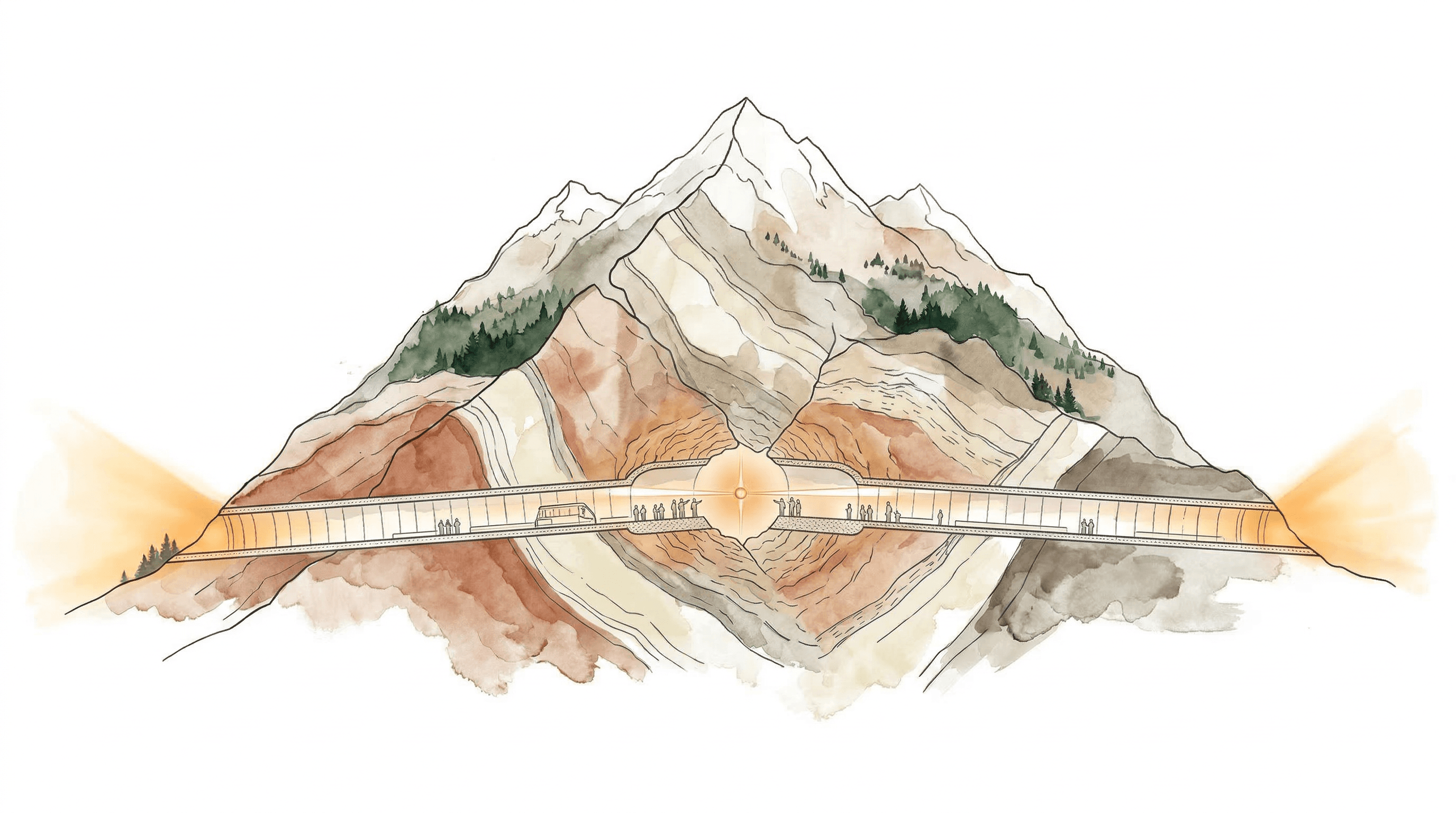 ![Generated image: [ILLUSTRATION: The mountain from the opening, but now the two tunnels have met. A thin line of light connects them through the center. The mountain is still solid, still massive, but the passage exists. From the opening on each side, warm light spills out. Style: the same architectural-meets-watercolor as the opening illustration, but completed. A before-and-after in two images across the essay. Muted earth tones. Quiet. Hopeful.]