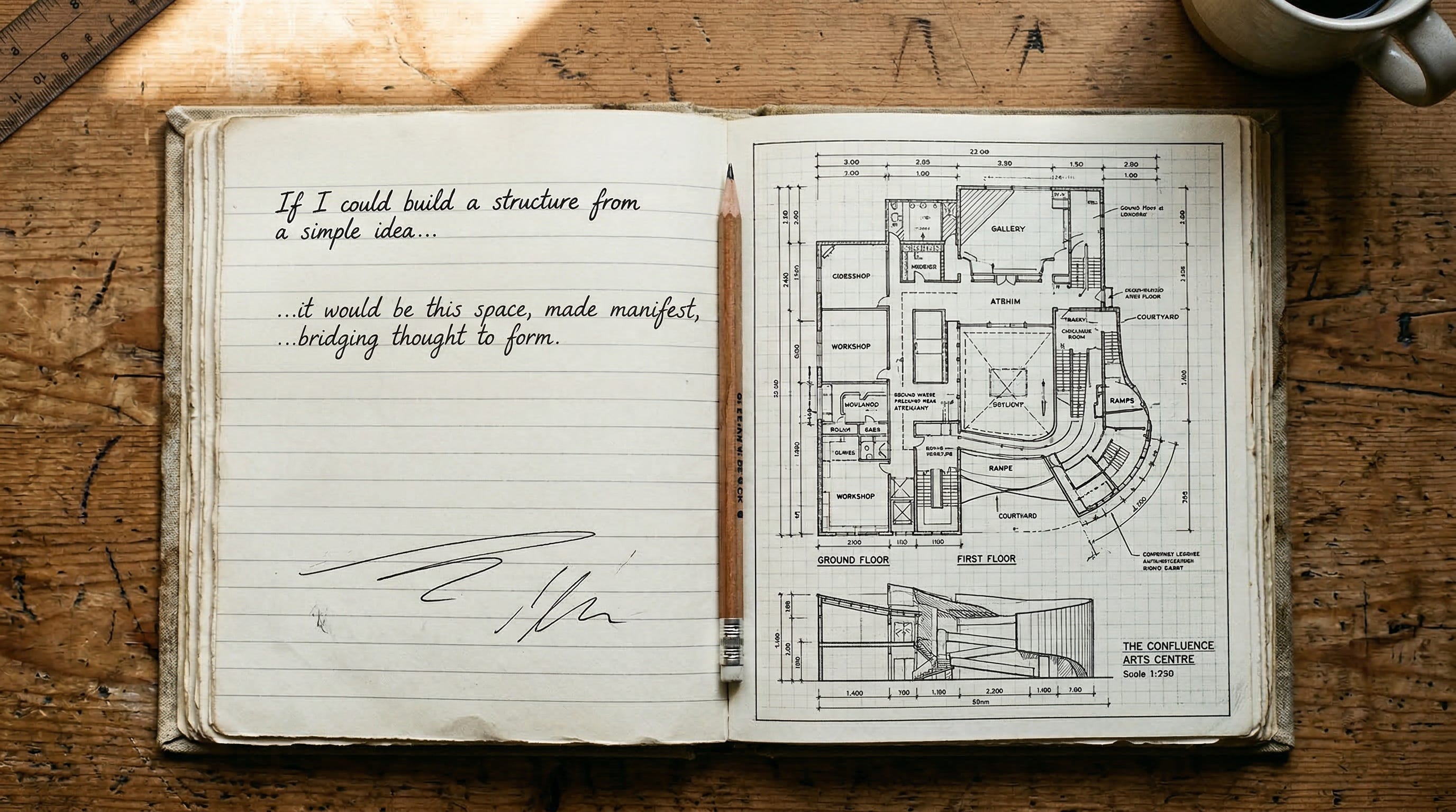 ![Generated image: [ILLUSTRATION: An aerial view of a landscape split by a river. On the left bank: orderly rows of identical buildings, clean grid streets, one style. On the right bank: varied architecture, winding streets, different building heights and styles, gardens growing between structures. Both sides are beautiful. Both sides are inhabited. The river between them has a single bridge under construction. Style: ink drawing, bird's eye view, detailed but not cluttered. Monochrome with touches of green on the right bank.]